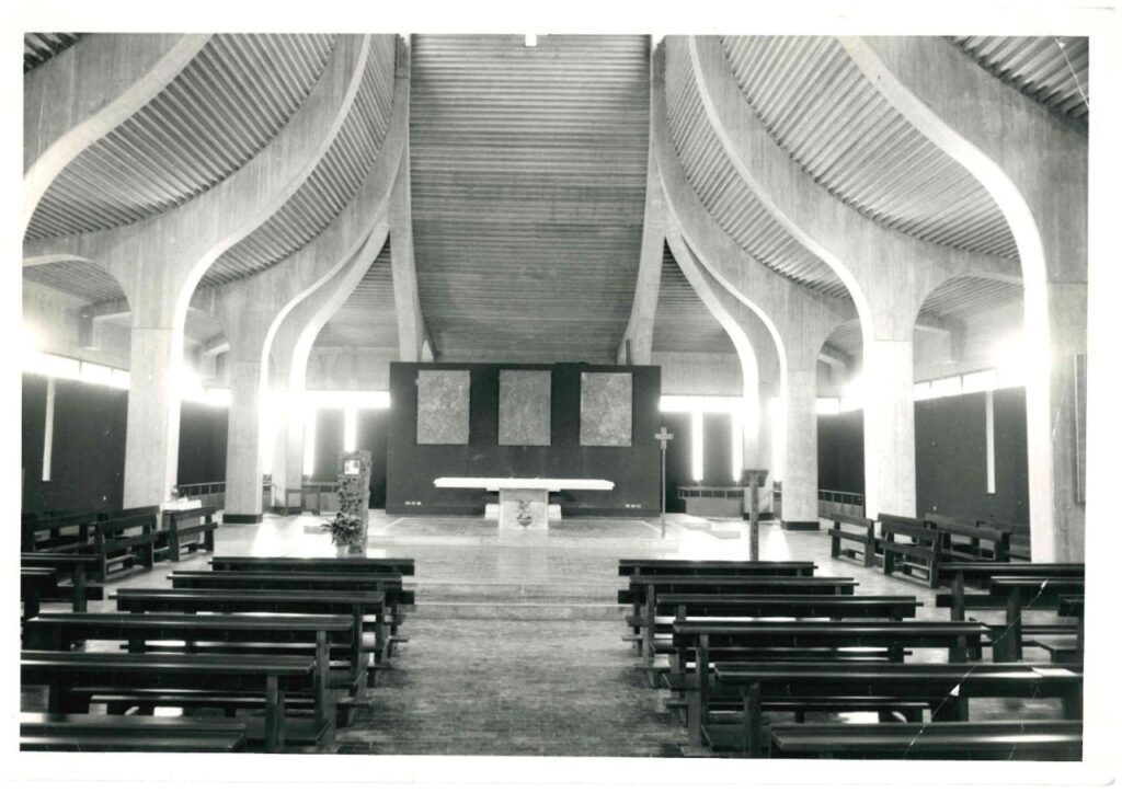 - Gardella lavora a lungo sul progetto, che modifica man mano, a partire da una versione iniziale molto più convenzionale, fino ad approdare alla soluzione plastica realizzata, con l’immaginario della “grande vela continua” (la tenda biblica), organizzando uno spazio scuro, che favorisce il raccoglimento, e grazie ai tagli con la luce naturale e al volume centrale, offre una spinta verso l’alto, con “l’ardimento alato” delle strutture di sostegno della copertura, completamente indipendente dalle murature perimetrali.